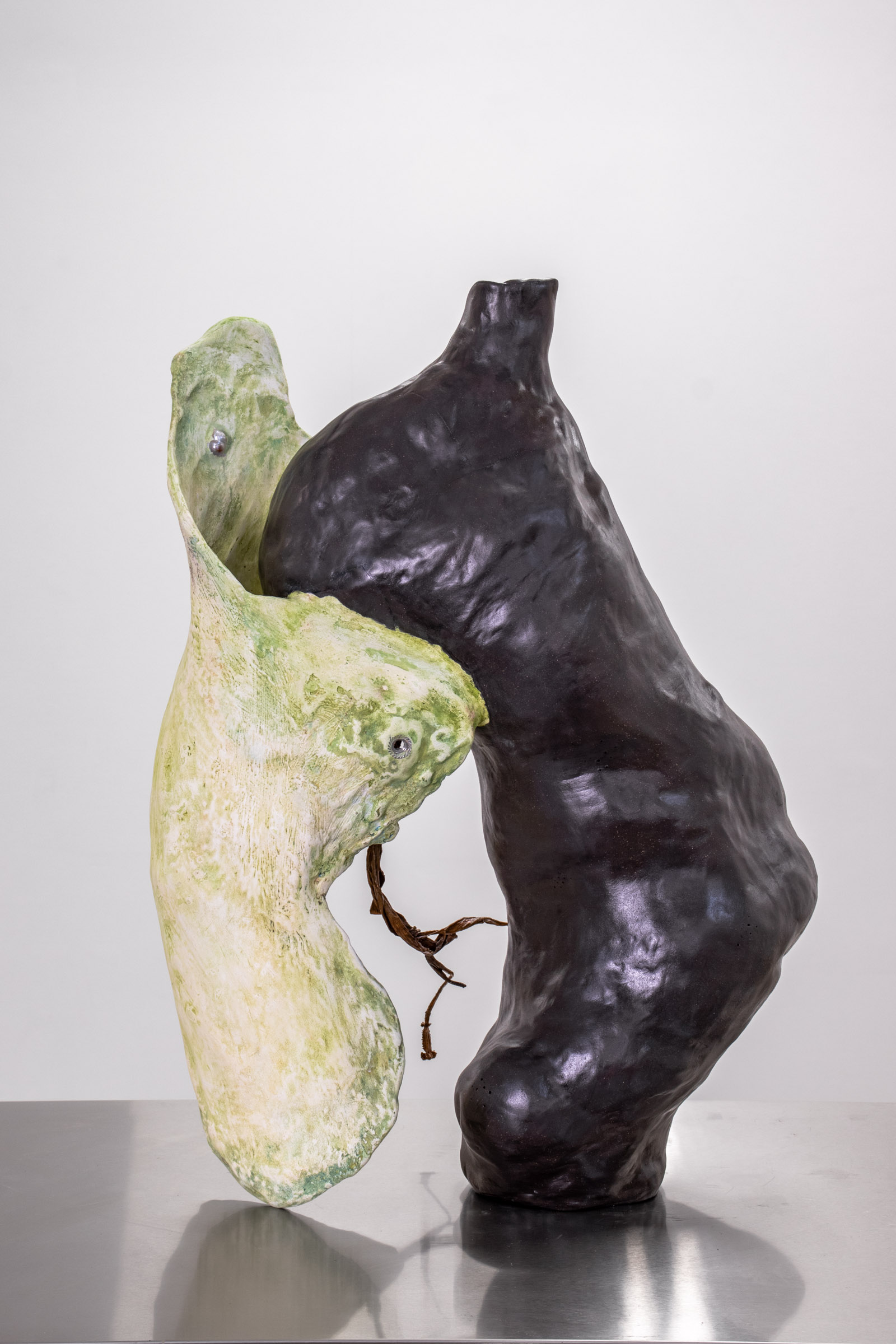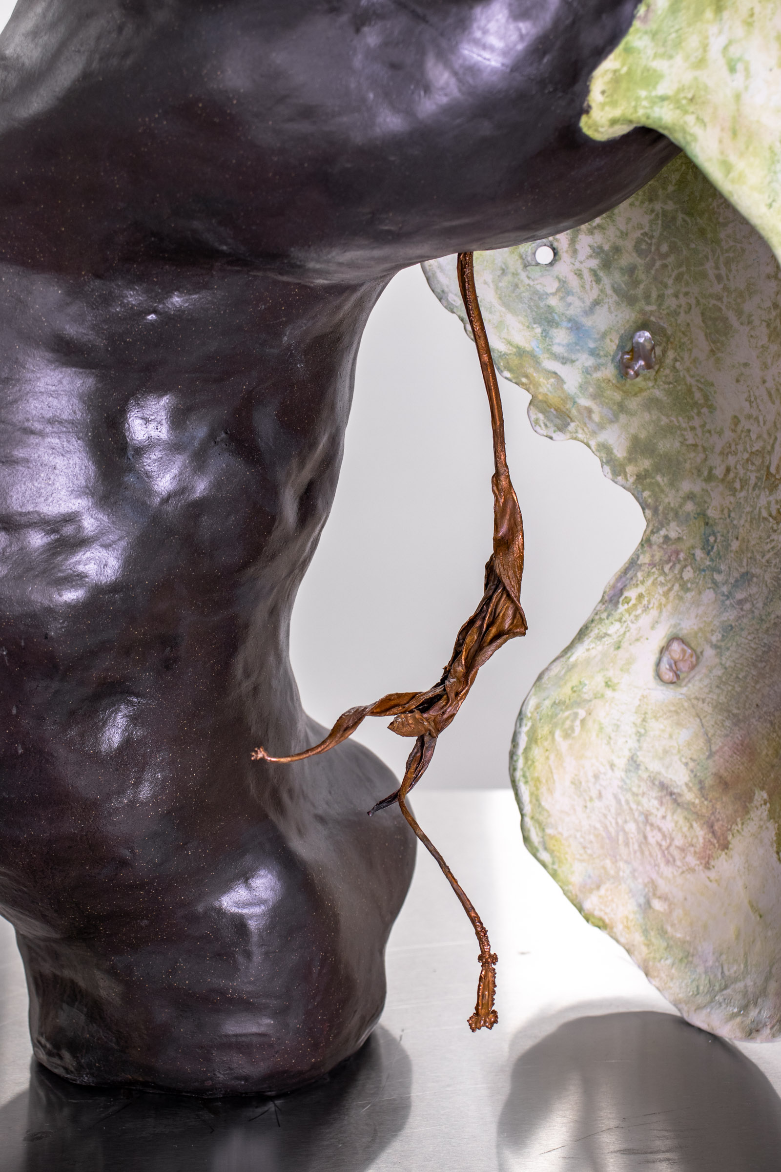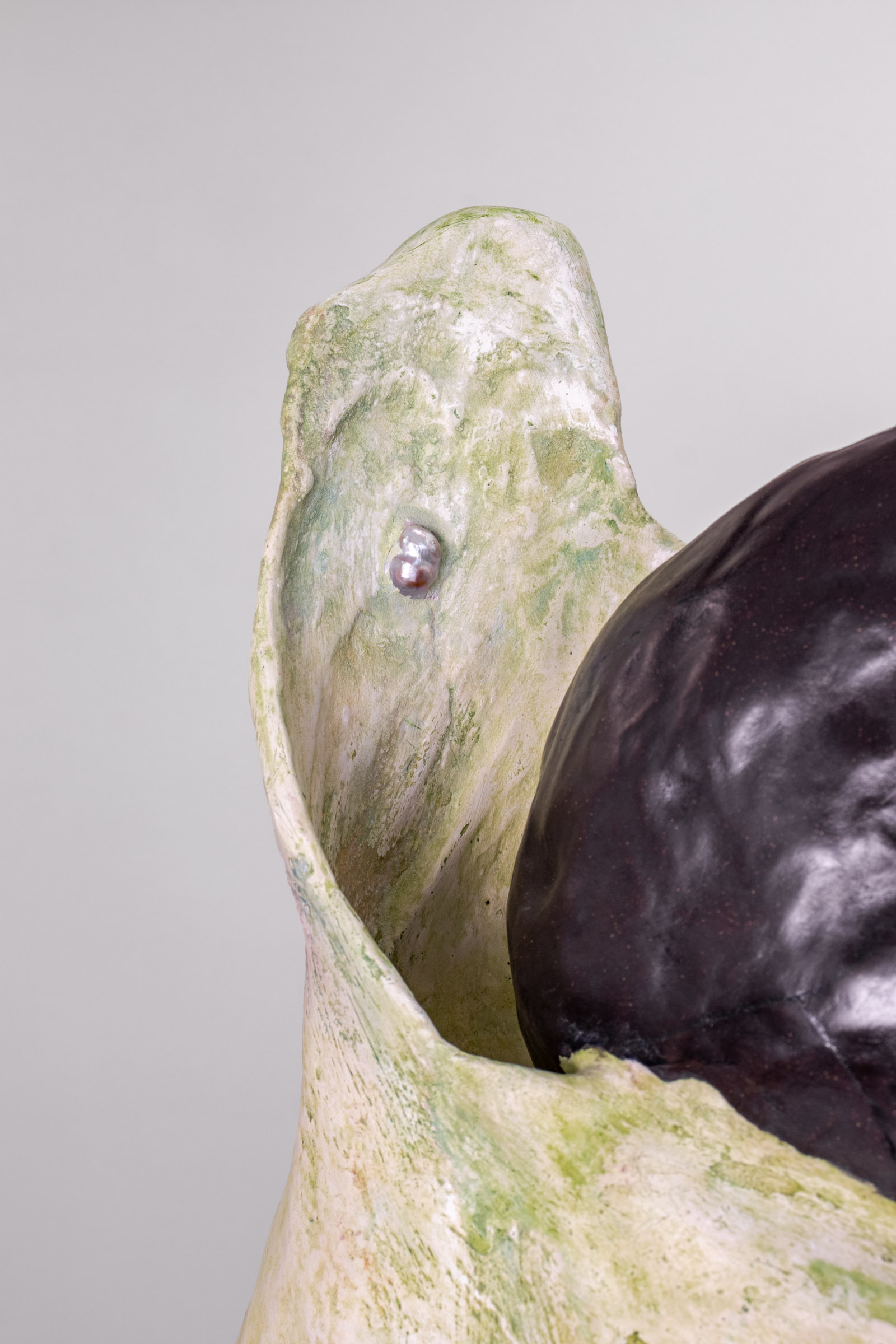 Fiberglass-reinforced gypsum cement, concrete pigment, stoneware, stainless steel hardware blister pearls, copper plated tulip force-bloomed in previous body of work (2023)