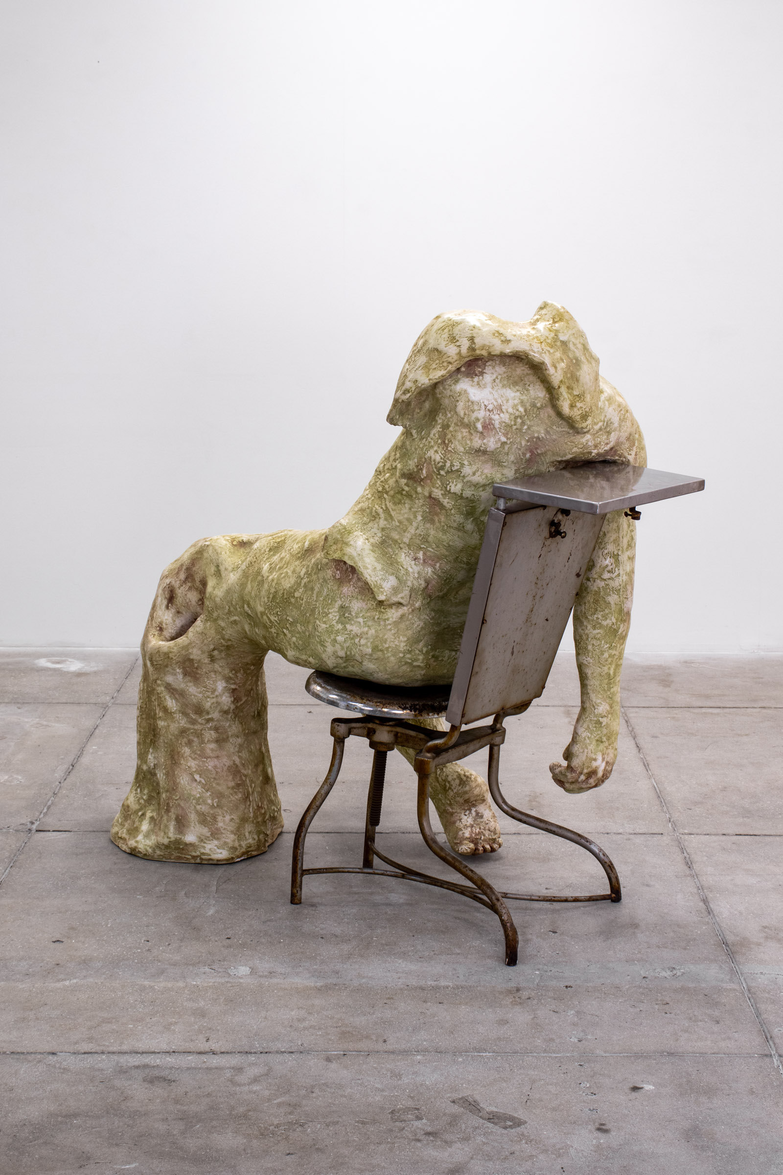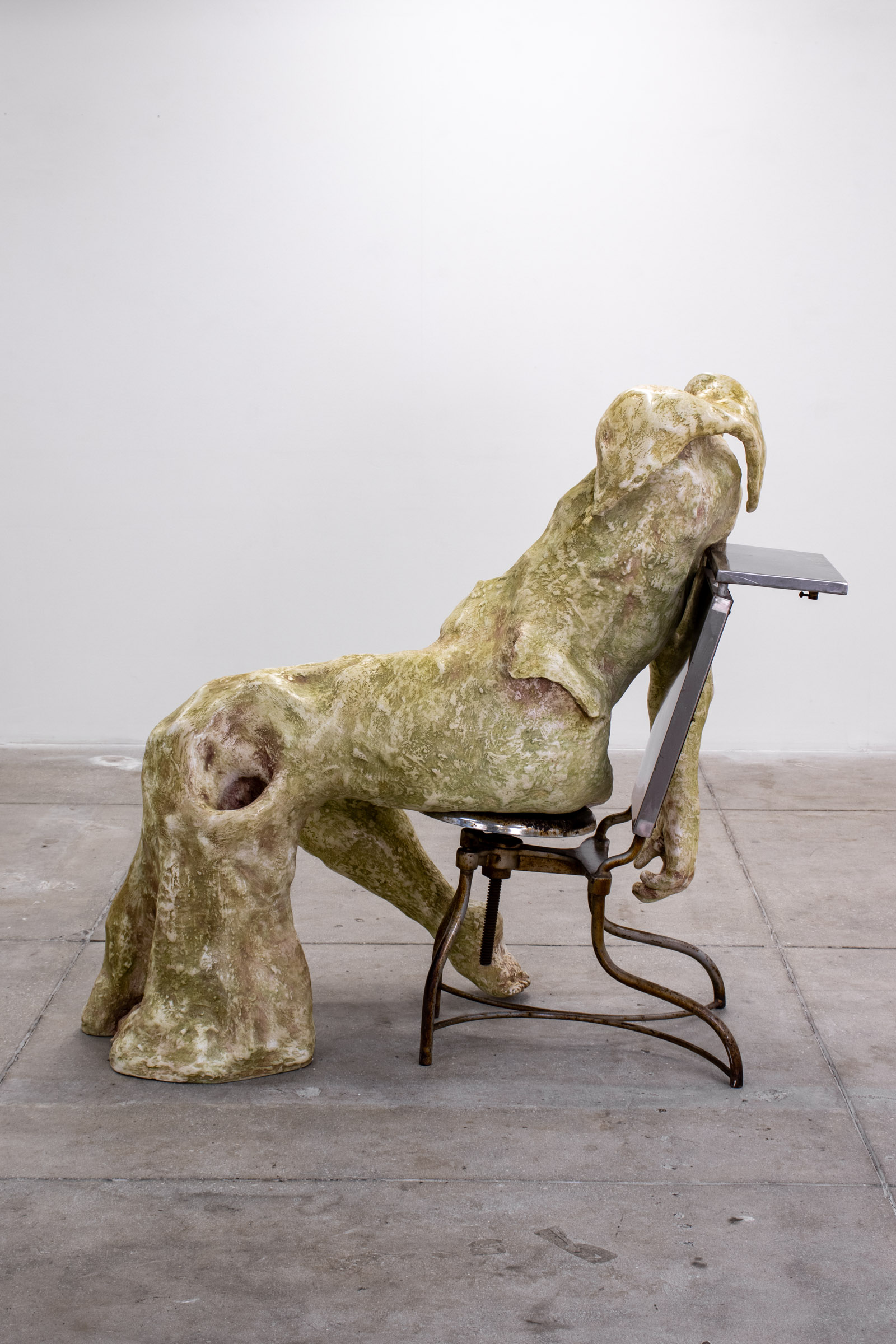 Fiberglass-reinforced gypsum cement, concrete pigment, pigmented wax, steel medical examination chair, cast beeswax candles with four rotating fragrances