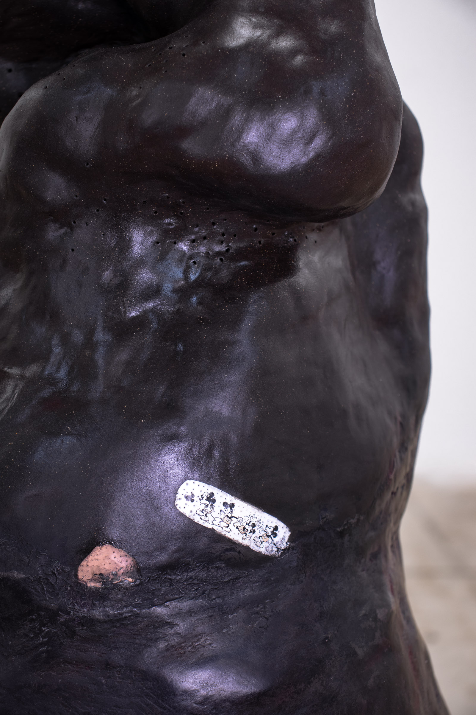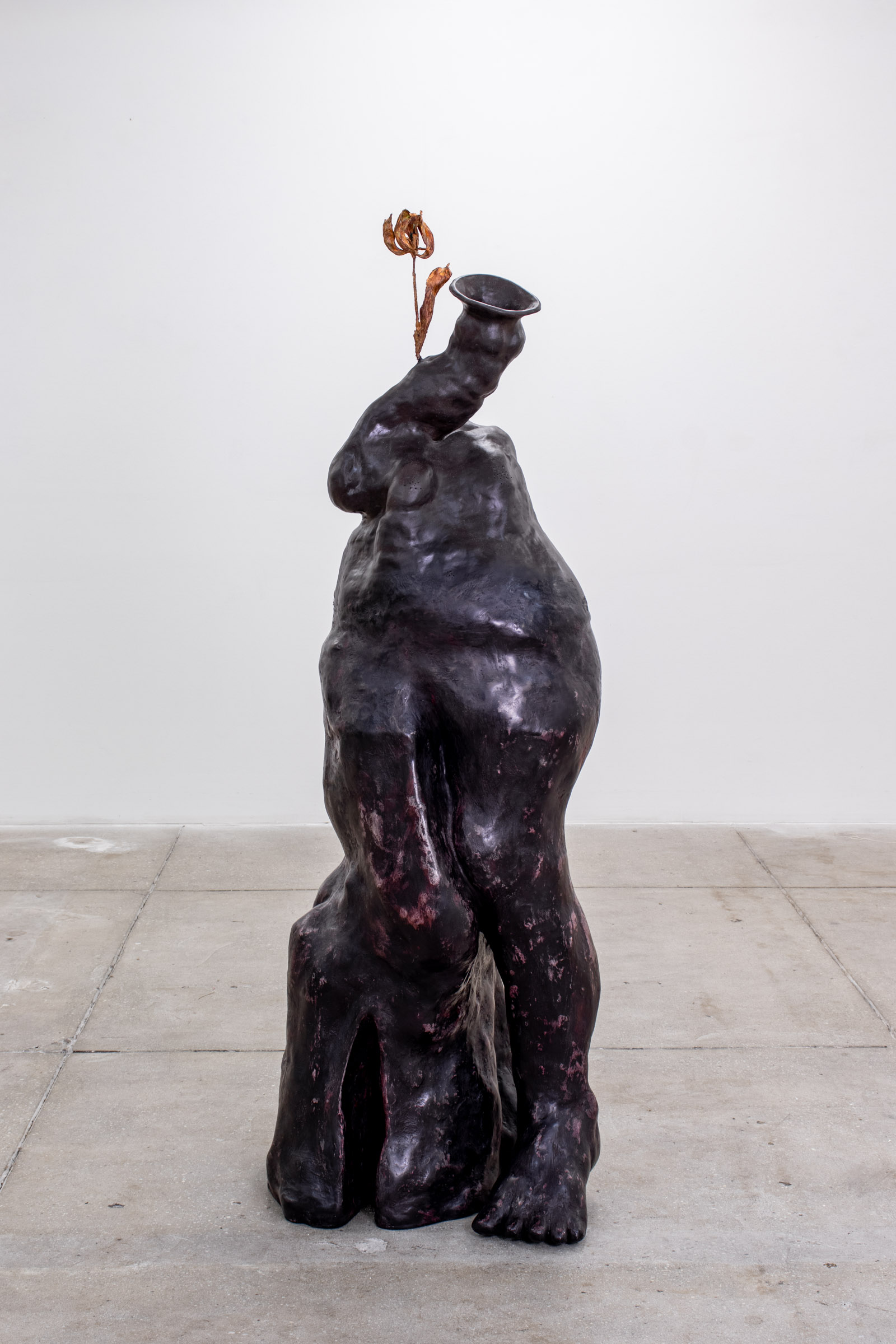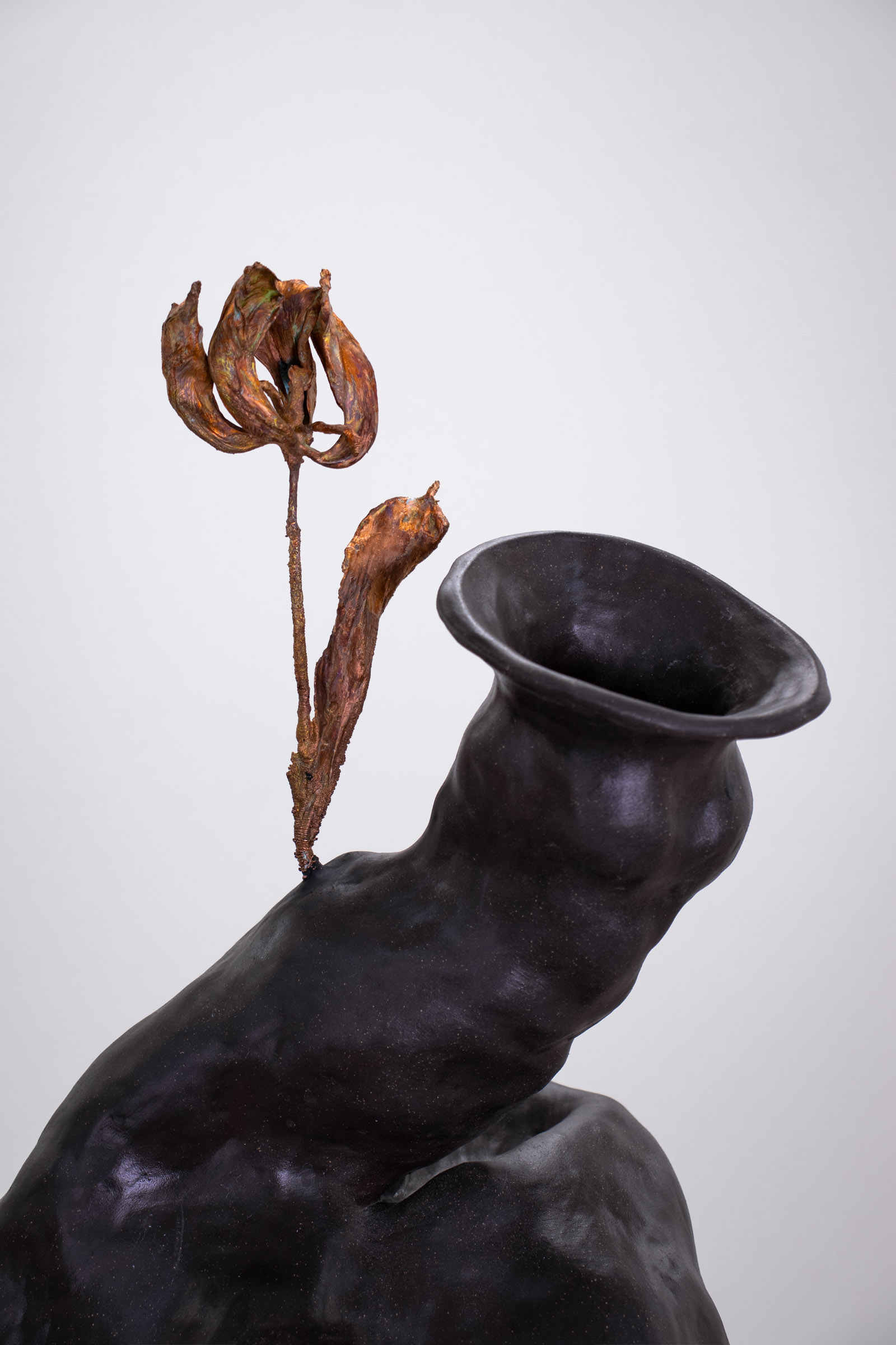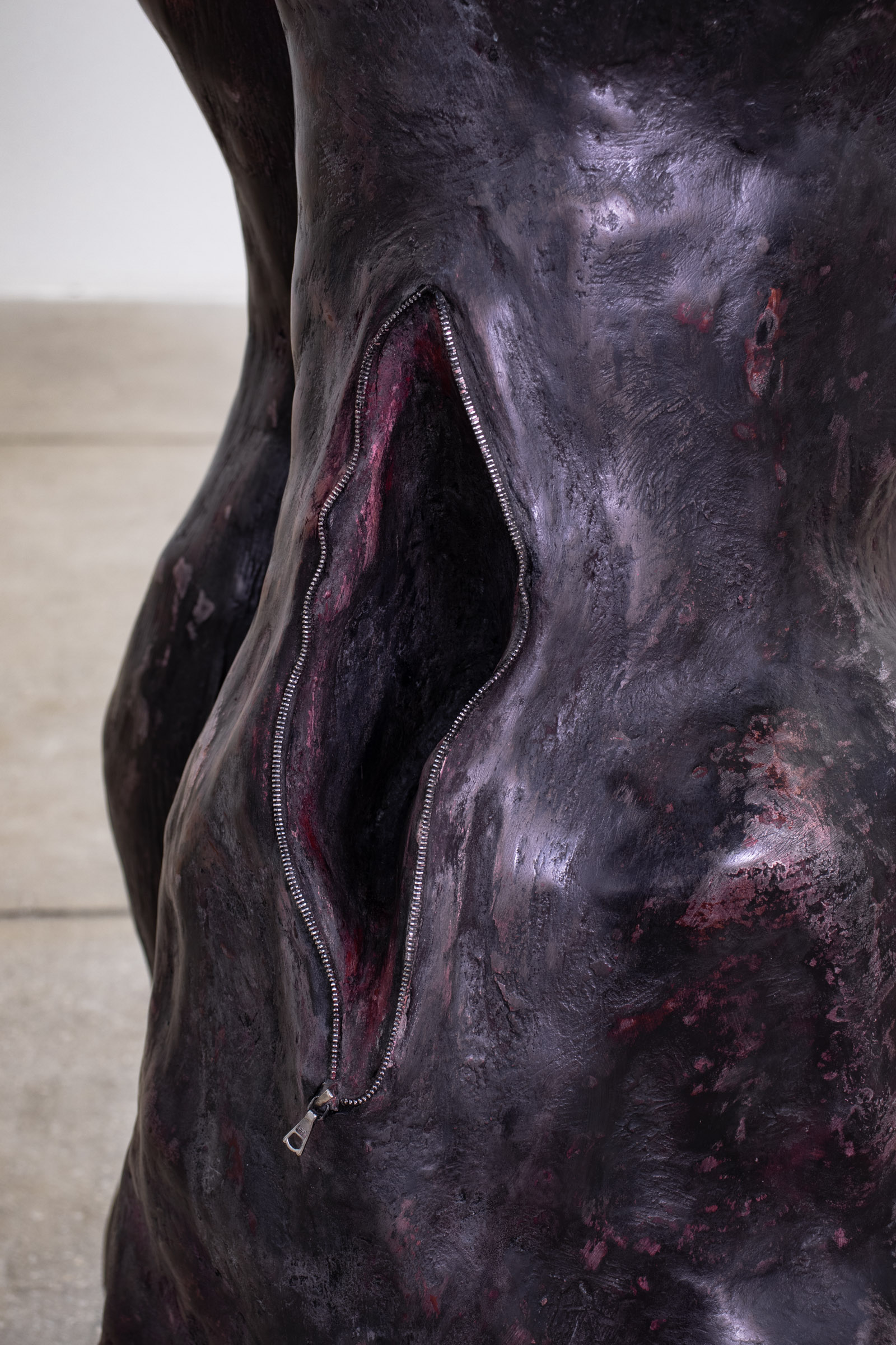 Fiberglass-reinforced gypsum cement, concrete pigment, stoneware, oil paint, linseed oil, ink, wax, band-aids, zipper, copper plated tulip force-bloomed in previous body of work (2019)