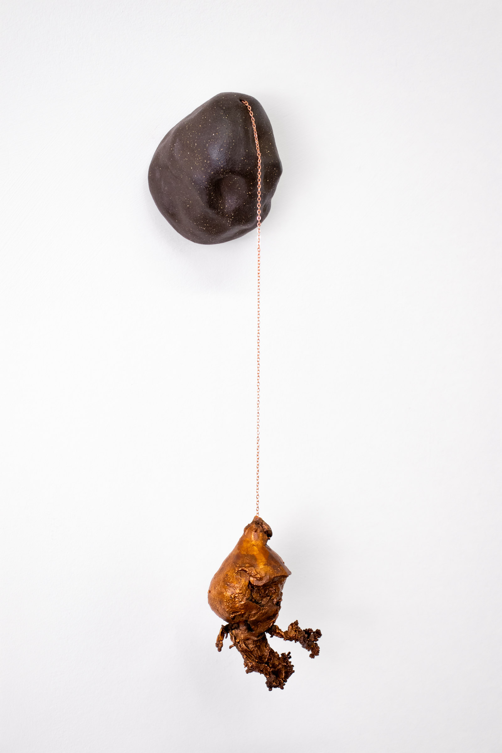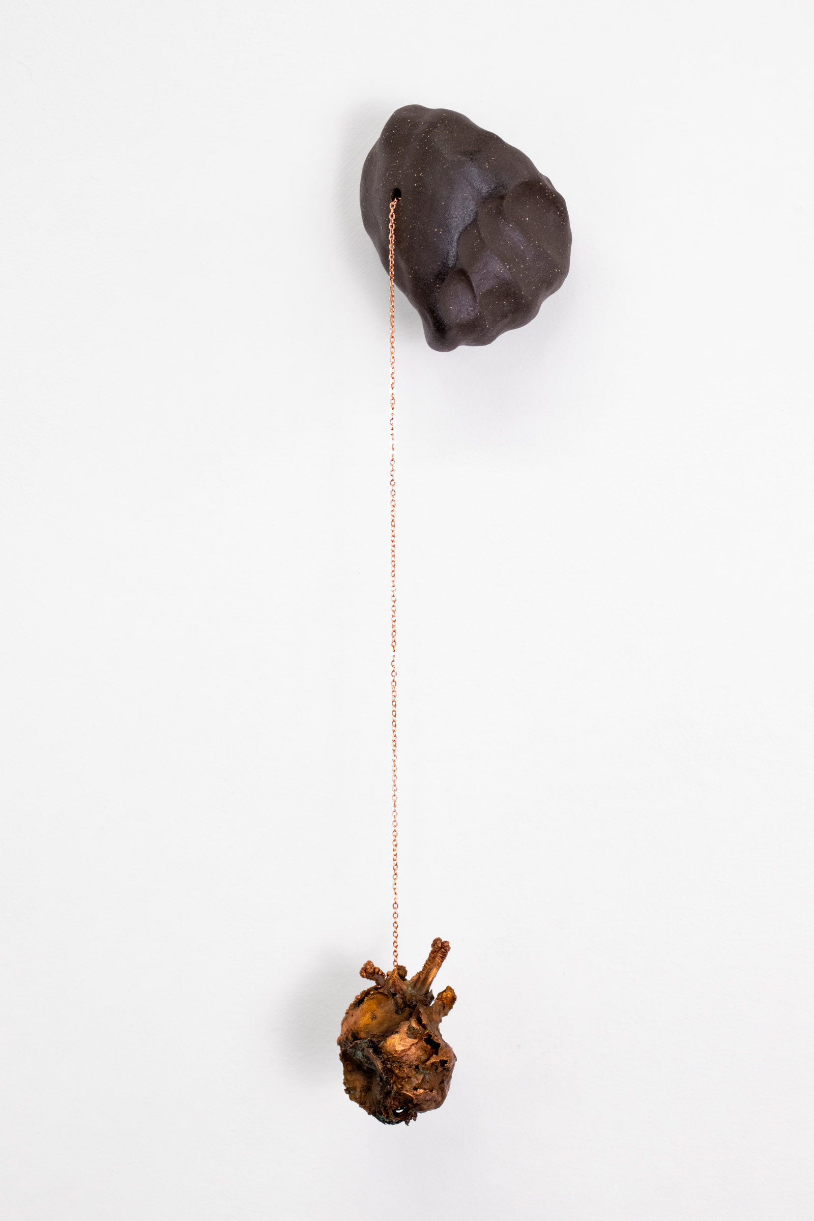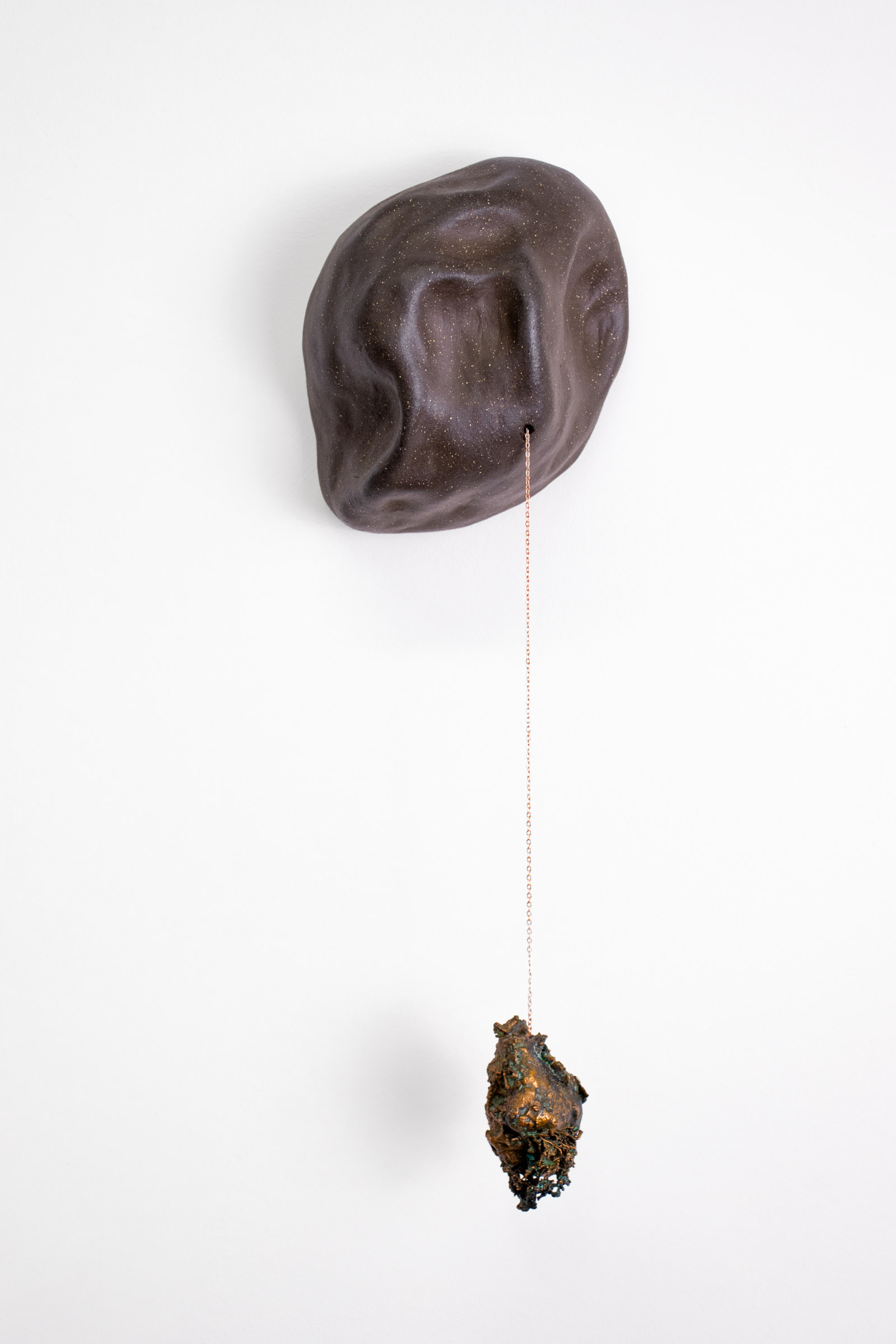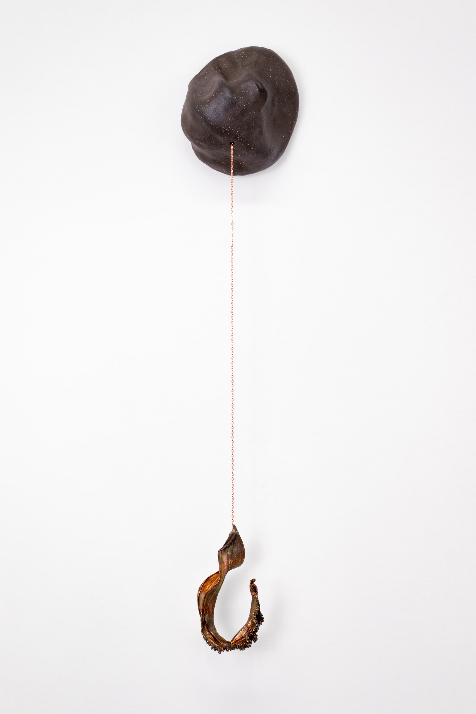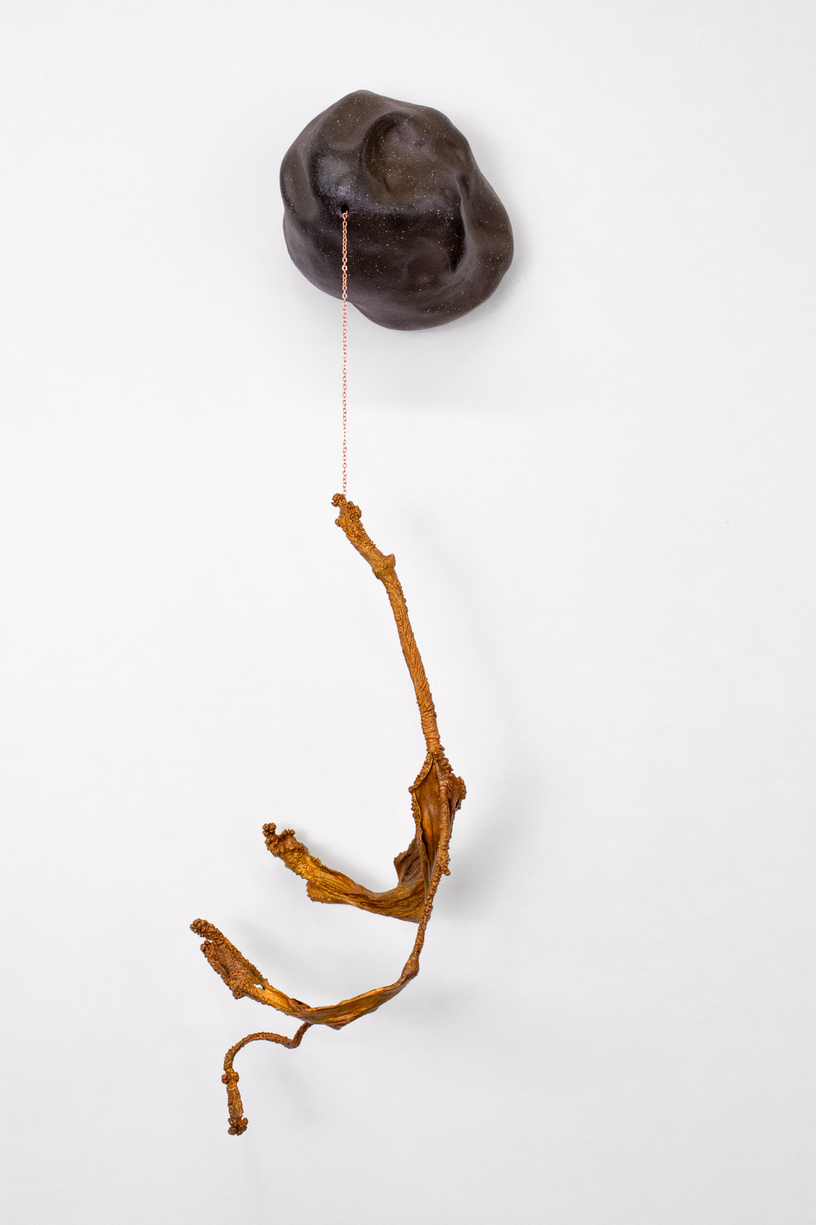 Copper plated tulip force-bloomed in previous body of work, copper chain, stoneware